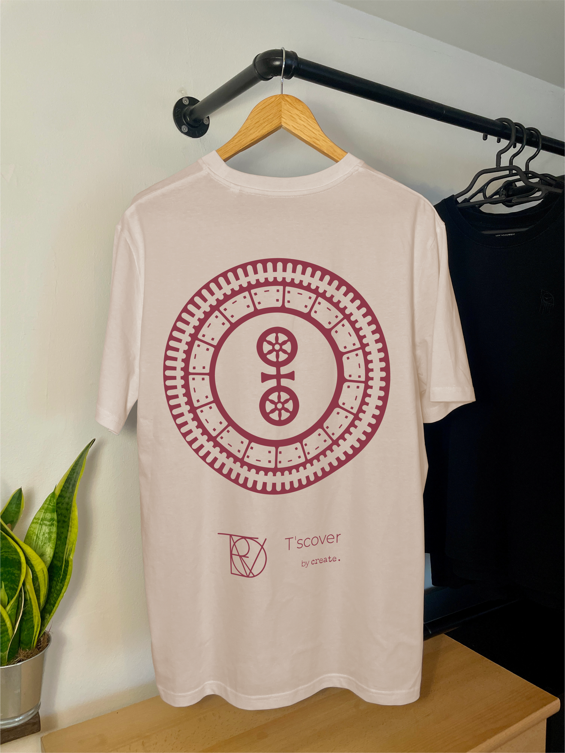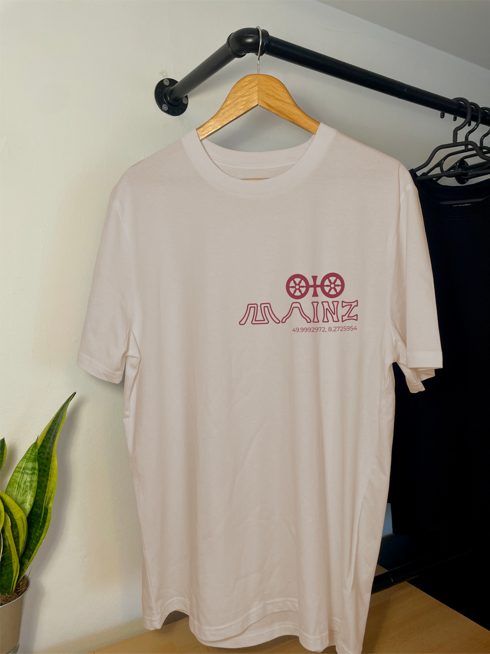 In Vintage-White geht es in die Stadt im Rhein-Main Gebiet. Der rote back print zeigt das Kanaldeckel Muster mit dem Mainzer Doppelrad. Genau wie weitere Shirts der T'scover Kollektion ist auf der Vorderseite des T-Shirts ein Symbol und die Koordinaten des Kanaldeckels abgebildet.